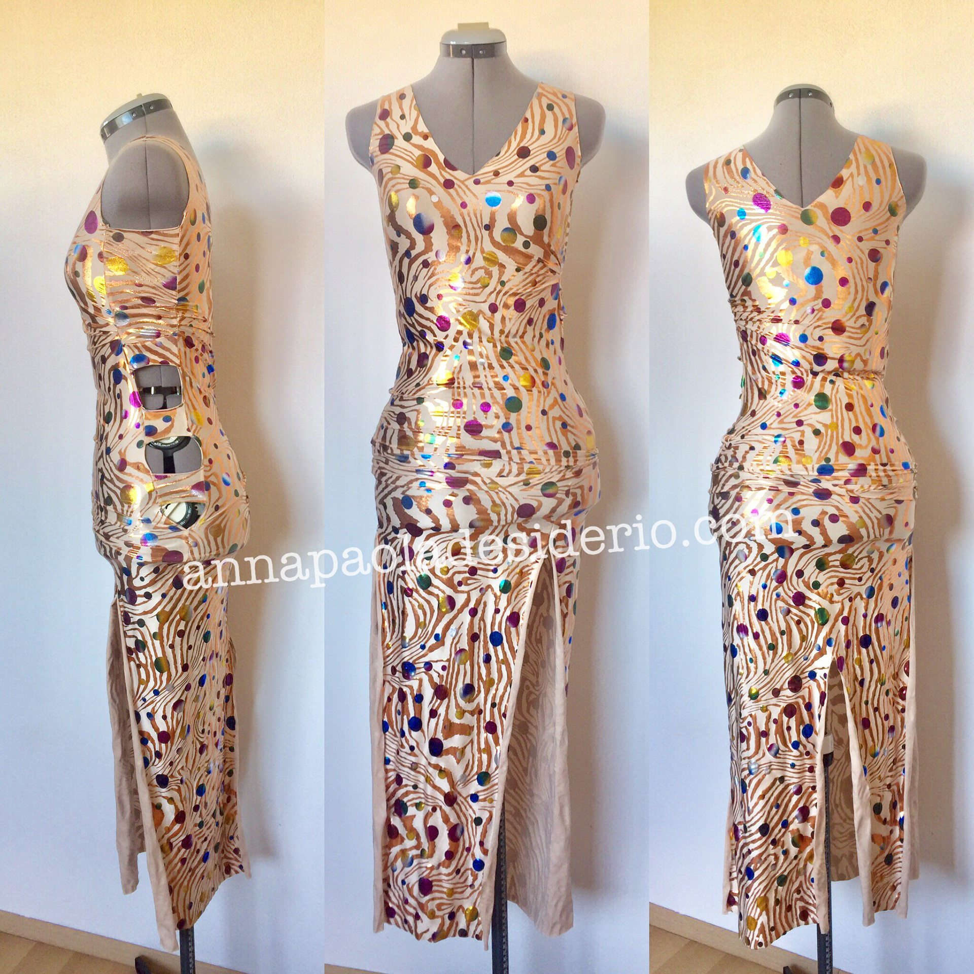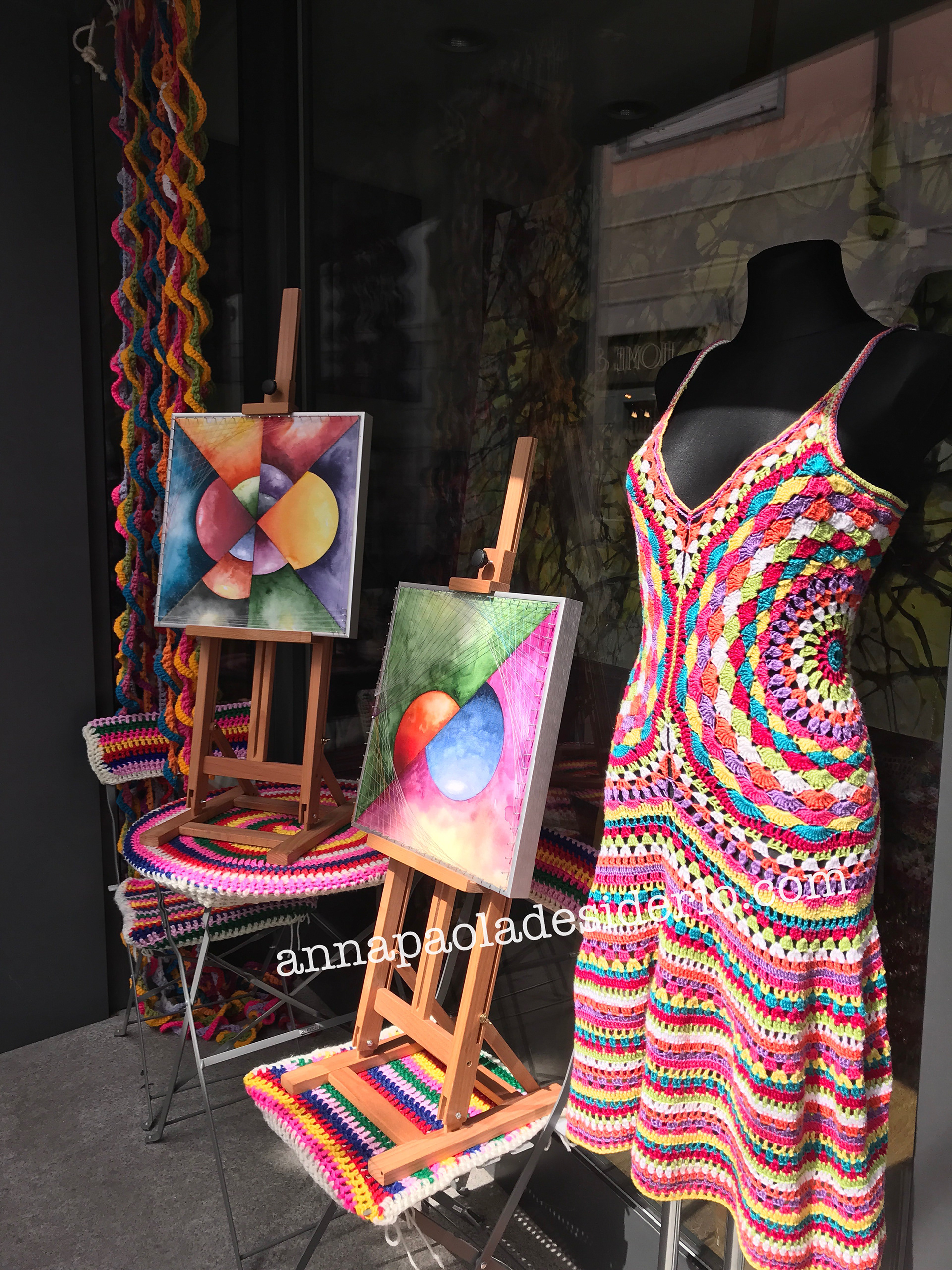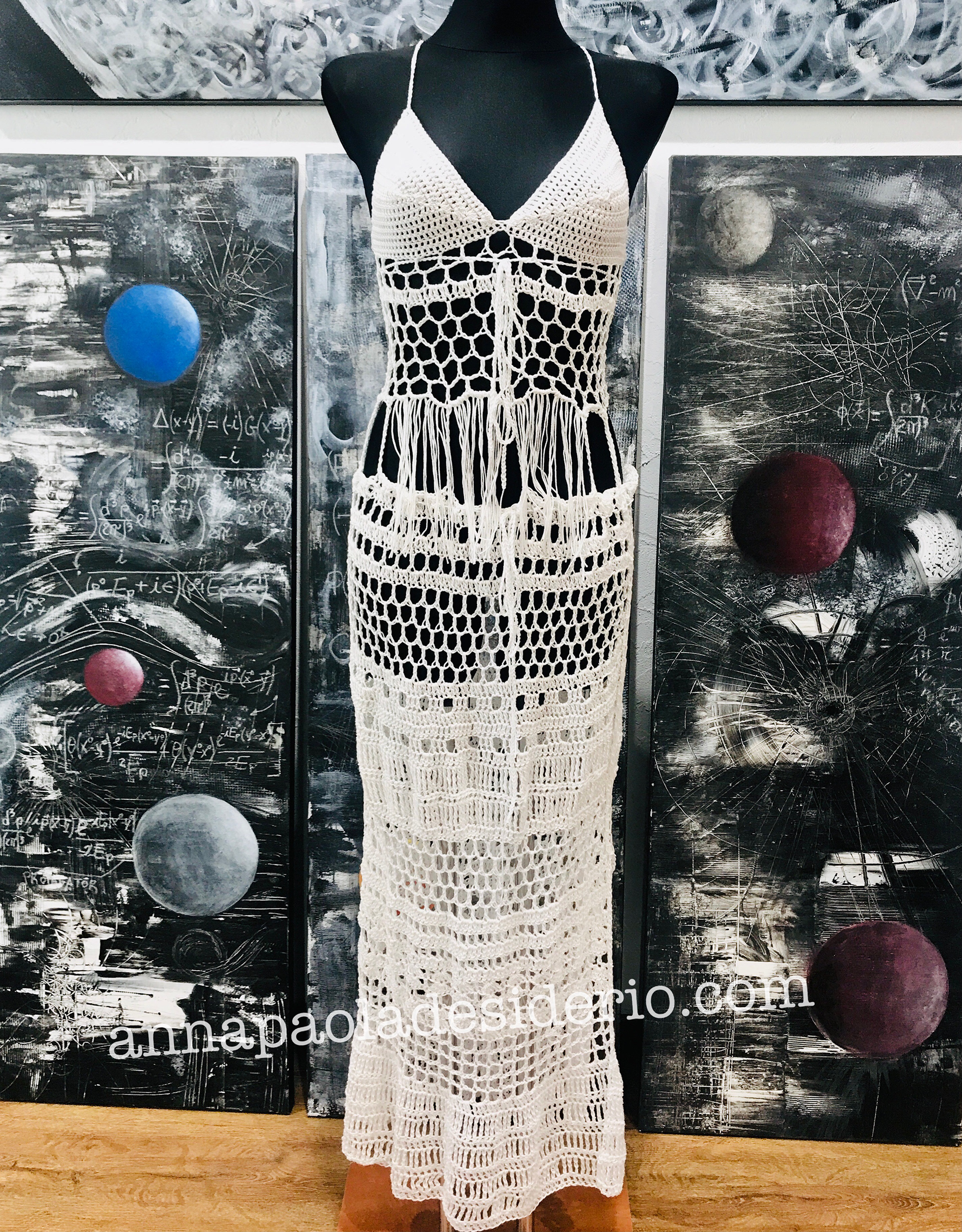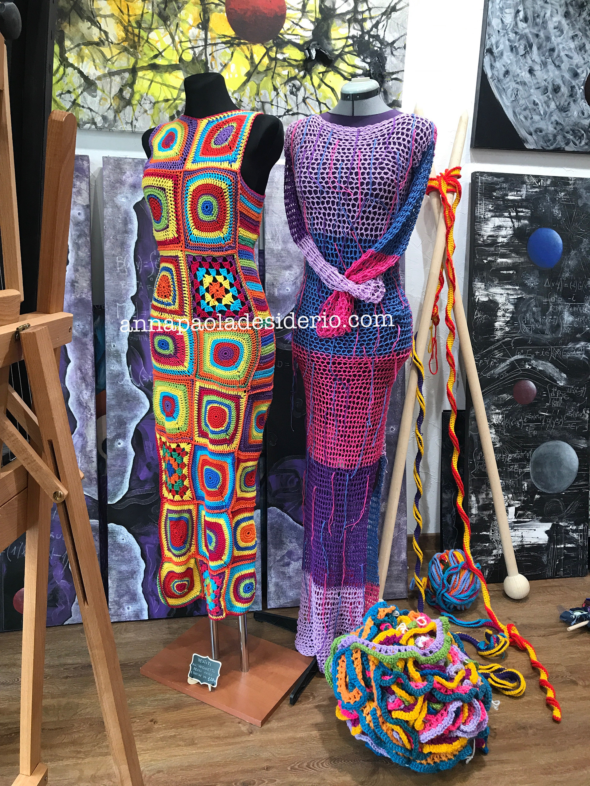 and among my researches there’s also textile art and costumes design. Because of my great passion for dancing and performance art, I started to create costumes by myself. This led me to choose soft and comfortable fabrics such as stretchy viscose, cotton and other elastic materials. Later on these dance costumes became very minimalistic dresses to also wear in my daily life, adding pieces with the ancient art of crochet. I consider working with fabrics and yarn as a real artistic action, free from every rigid technique and schemes as in my other artistic expressions. I’m not a seamstress, I don’t use pre-designed patterns, I don’t draw anything beforehand. I’m only alone with my fabrics, a mannequin, a pair of scissors, some yarn and crochet hooks. Taking inspirations from colours and the kind of fabrics and yarn I come across. With my emotions in the moment, I start to create the dress. In this way, every dress is different from the other. Even if they have the same design, they are always different. They have asymmetrical parts, different cuts, different lengths and some imperfections. They’re all unique and original handmade pieces and are all part of my artistic gesture.